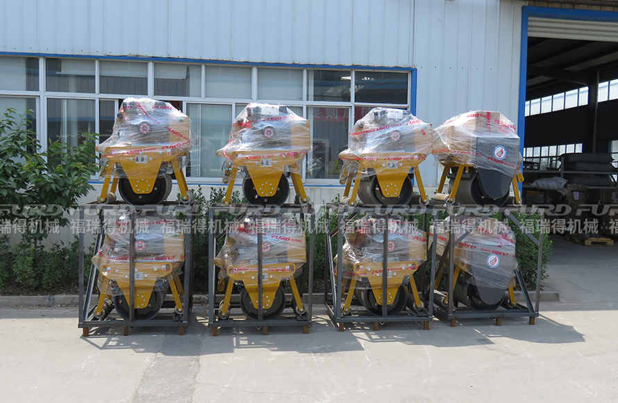 福瑞得12臺(tái)手扶單鋼輪壓路機(jī)打包裝車發(fā)往河南