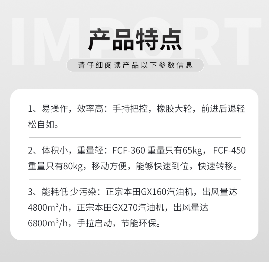 用于水泥、瀝青路面的清掃、清潔。 1.本田汽油動(dòng)力,性能穩(wěn)定; 2.動(dòng)力平衡極好的風(fēng)葉,保證整體的穩(wěn)定性; 3.超大風(fēng)量,性能優(yōu)越。