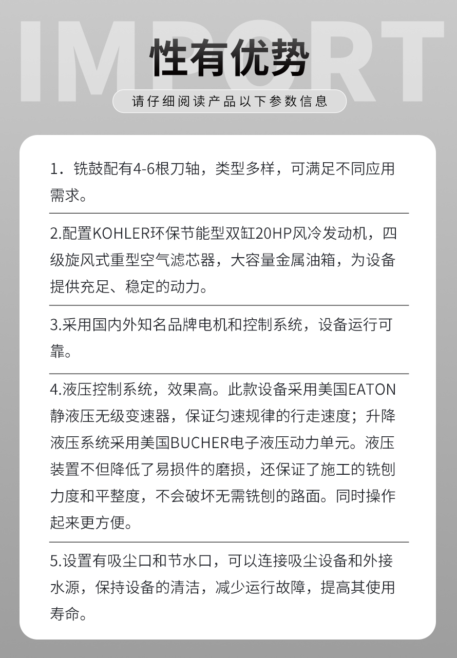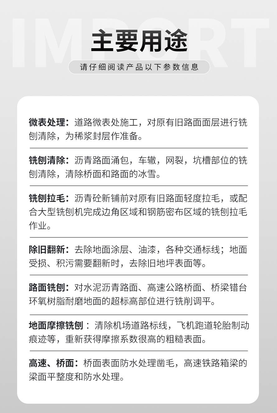 液壓銑刨機(jī)結(jié)構(gòu)緊湊,布局合理,具有控制精度高、性能穩(wěn)定、操作簡(jiǎn)單、維護(hù)保養(yǎng)方便等優(yōu)勢(shì)。其適合各種強(qiáng)度較高的混凝土瀝青等高出部分的去除工作,是其它類型的銑刨機(jī)無(wú)法替代的產(chǎn)品。